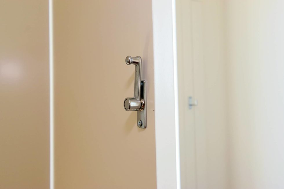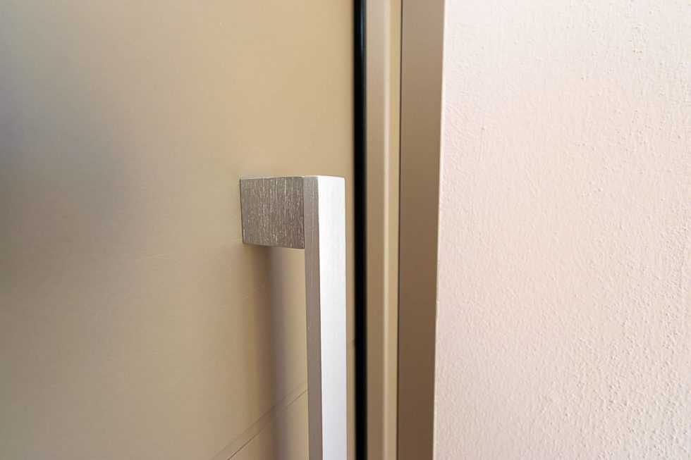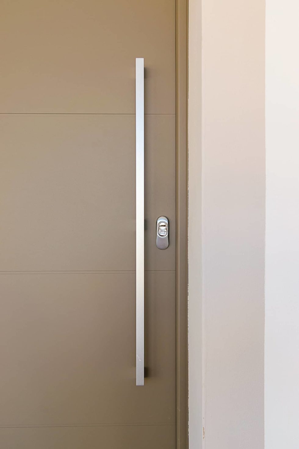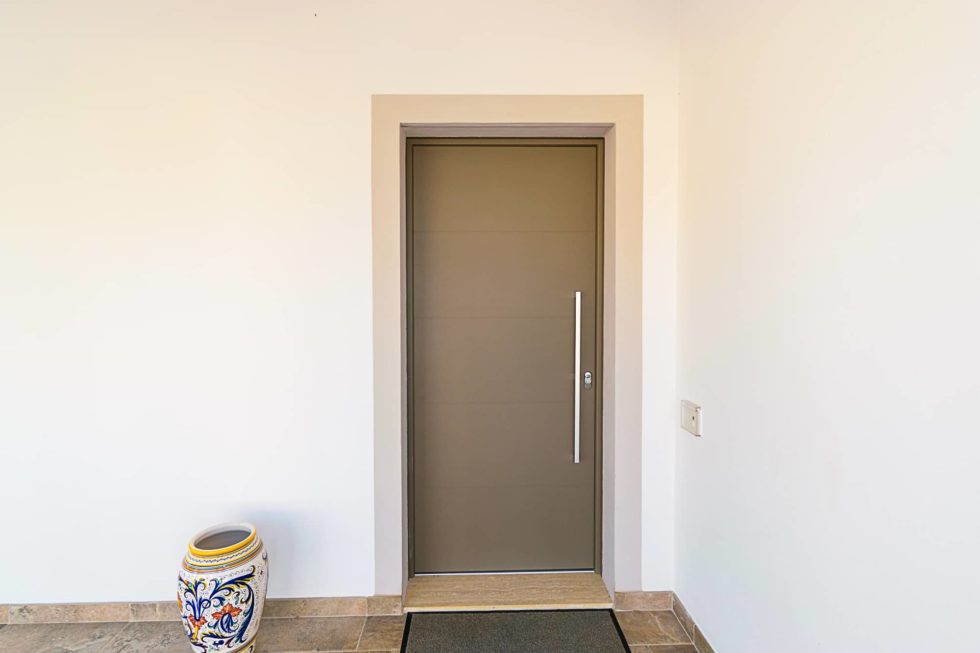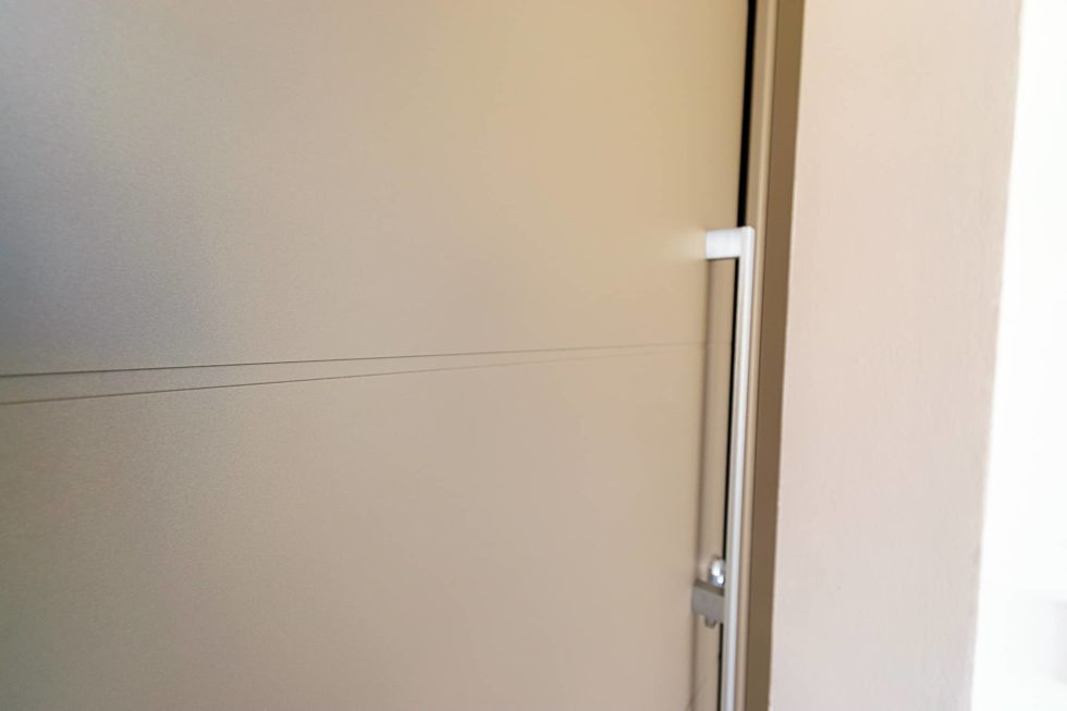 Il portone d’ingresso in legno-alluminio con esterno inciso a doghe orizzontali è un vero e proprio elemento di design, impreziosito da un maniglione verticale Arieni e dotato di una serratura di sicurezza AGB. Questo portone non solo valorizza l’estetica dell’abitazione, ma offre anche la massima sicurezza.