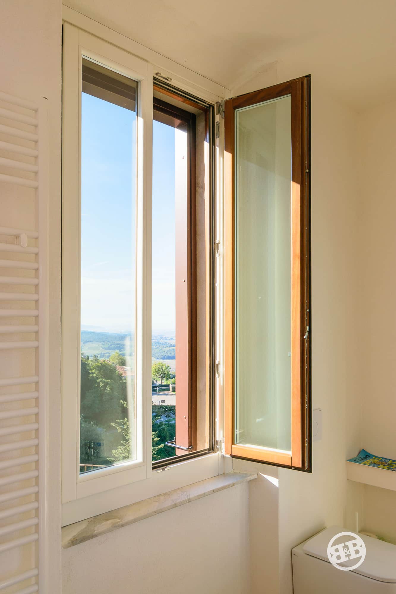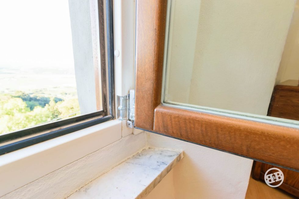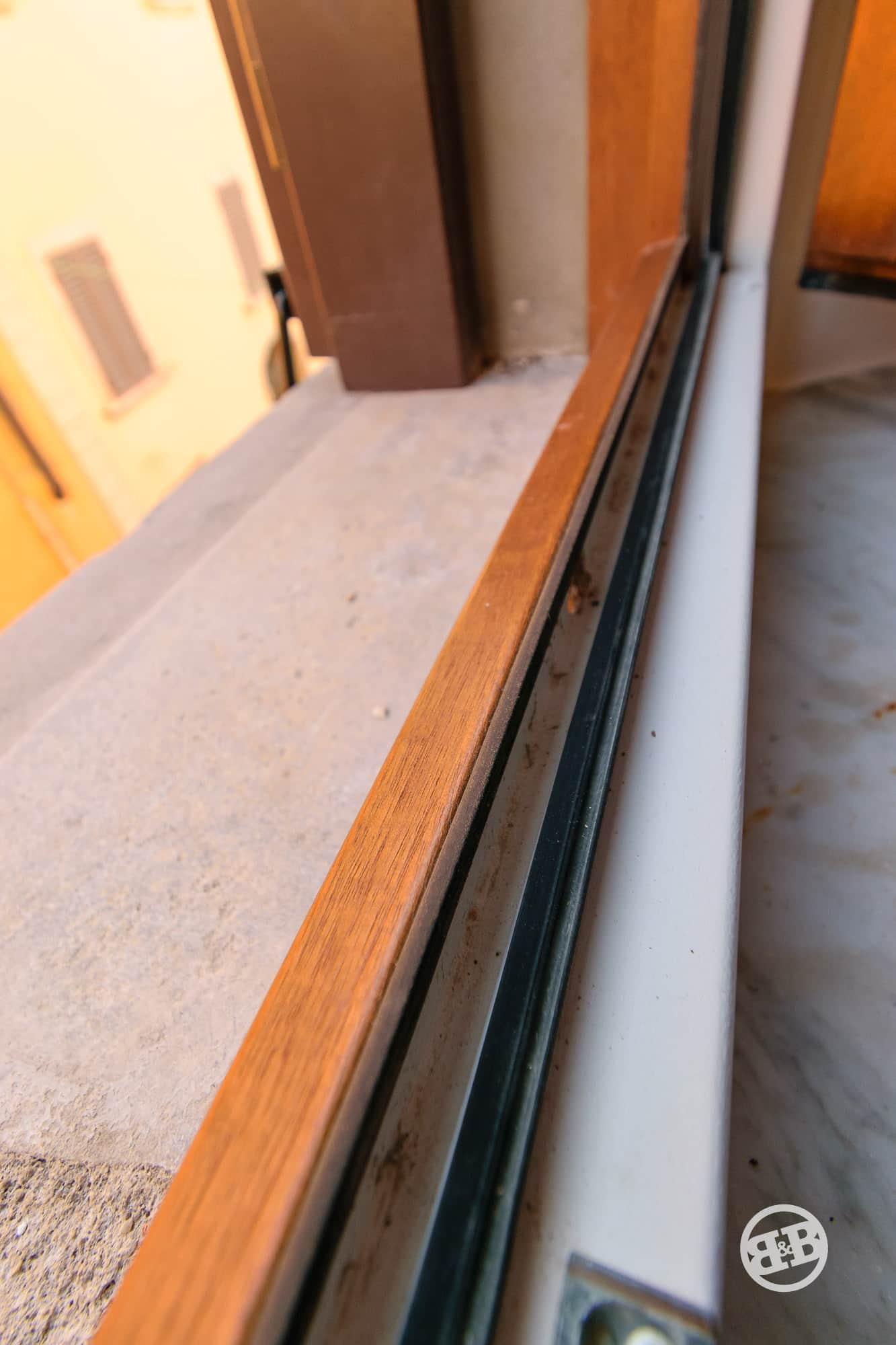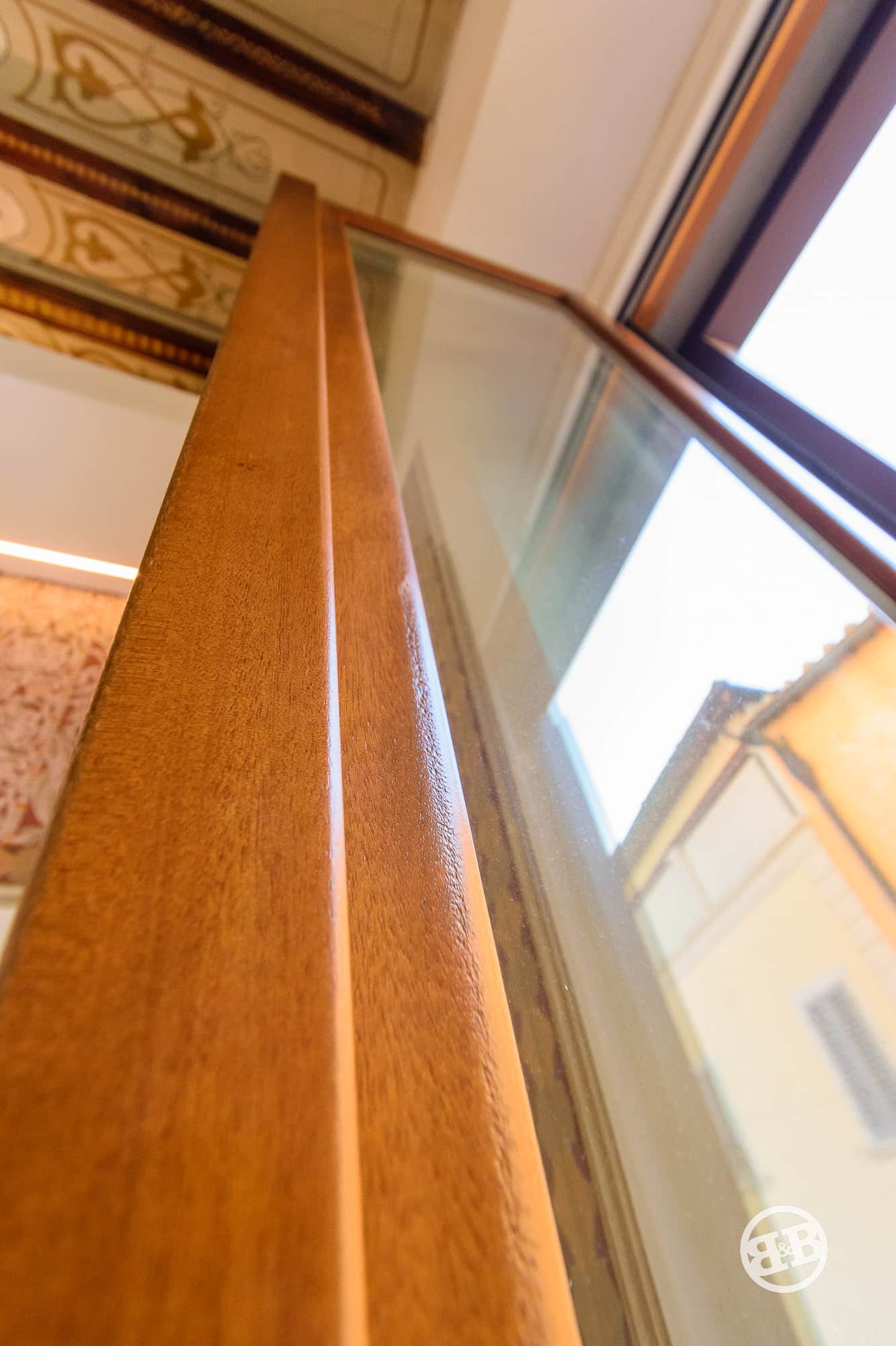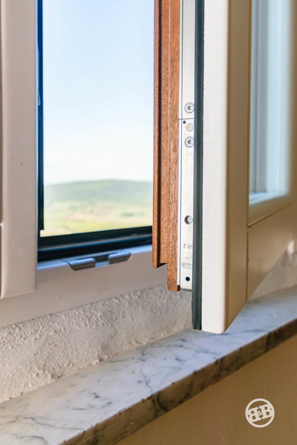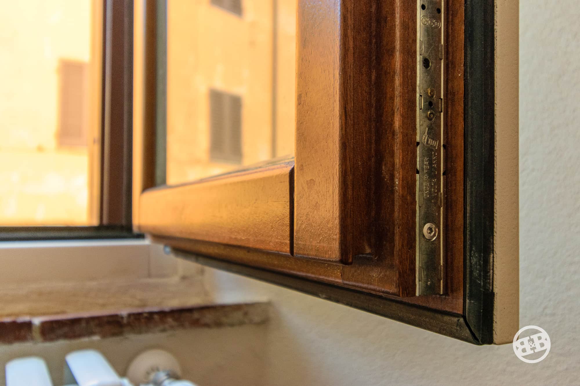Gli infissi, modello Sigilla 68 Plus, presentano una finitura bicolore — interno laccato bianco RAL 9010 ed esterno noce castagno — studiata per integrarsi perfettamente con i vincoli estetici imposti dal contesto storico.