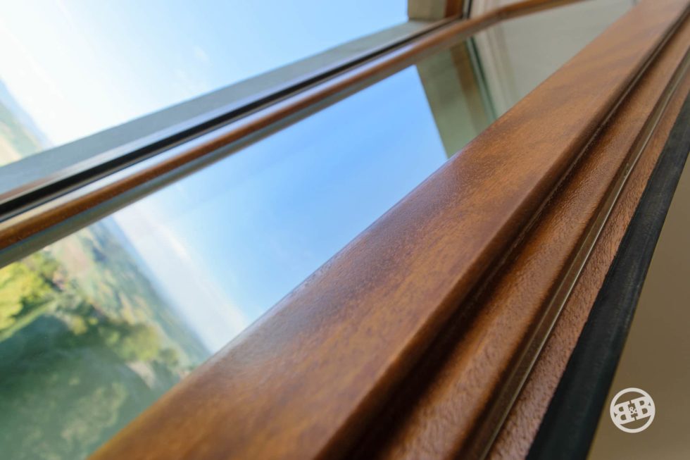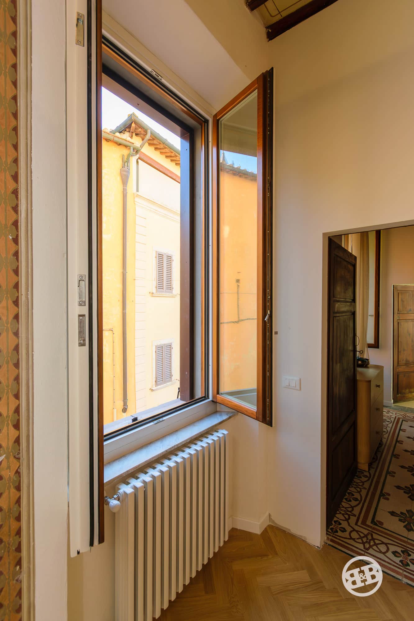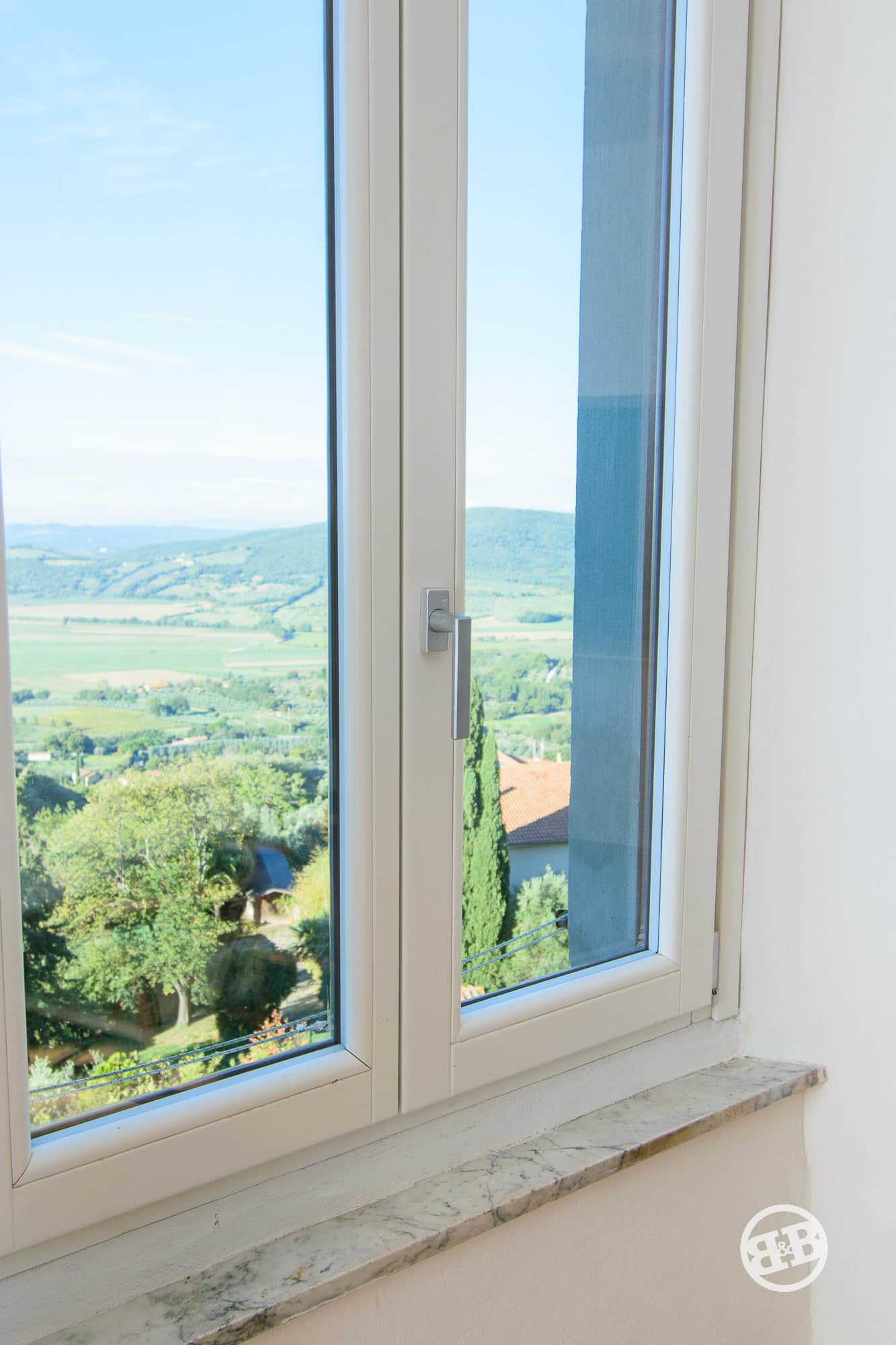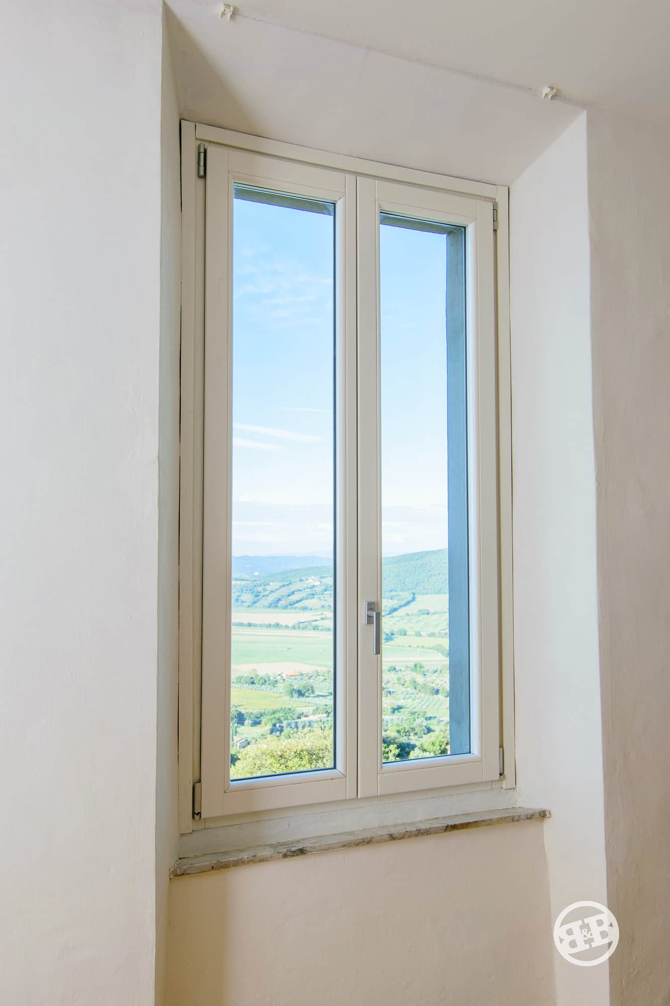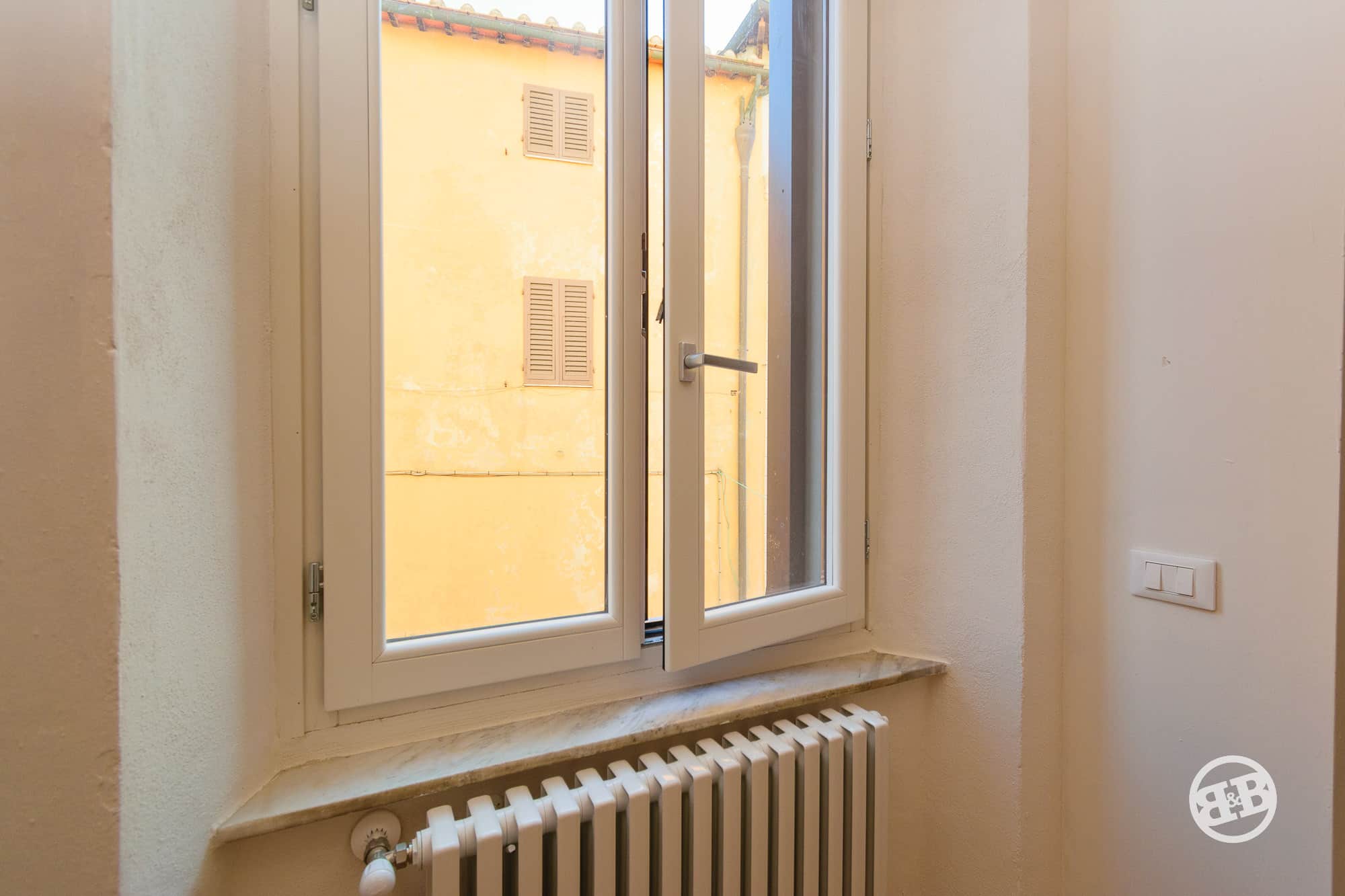 Gli infissi, modello Sigilla 68 Plus, presentano una finitura bicolore — interno laccato bianco RAL 9010 ed esterno noce castagno — studiata per integrarsi perfettamente con i vincoli estetici imposti dal contesto storico.