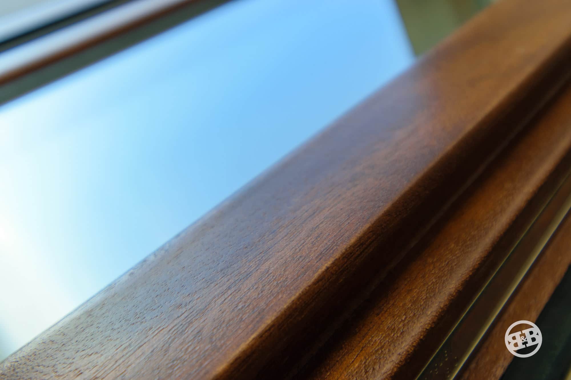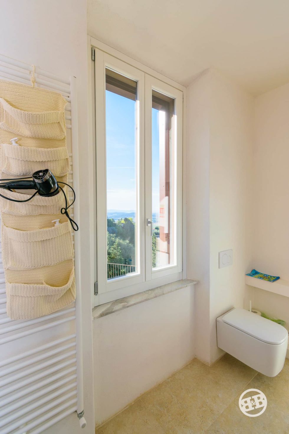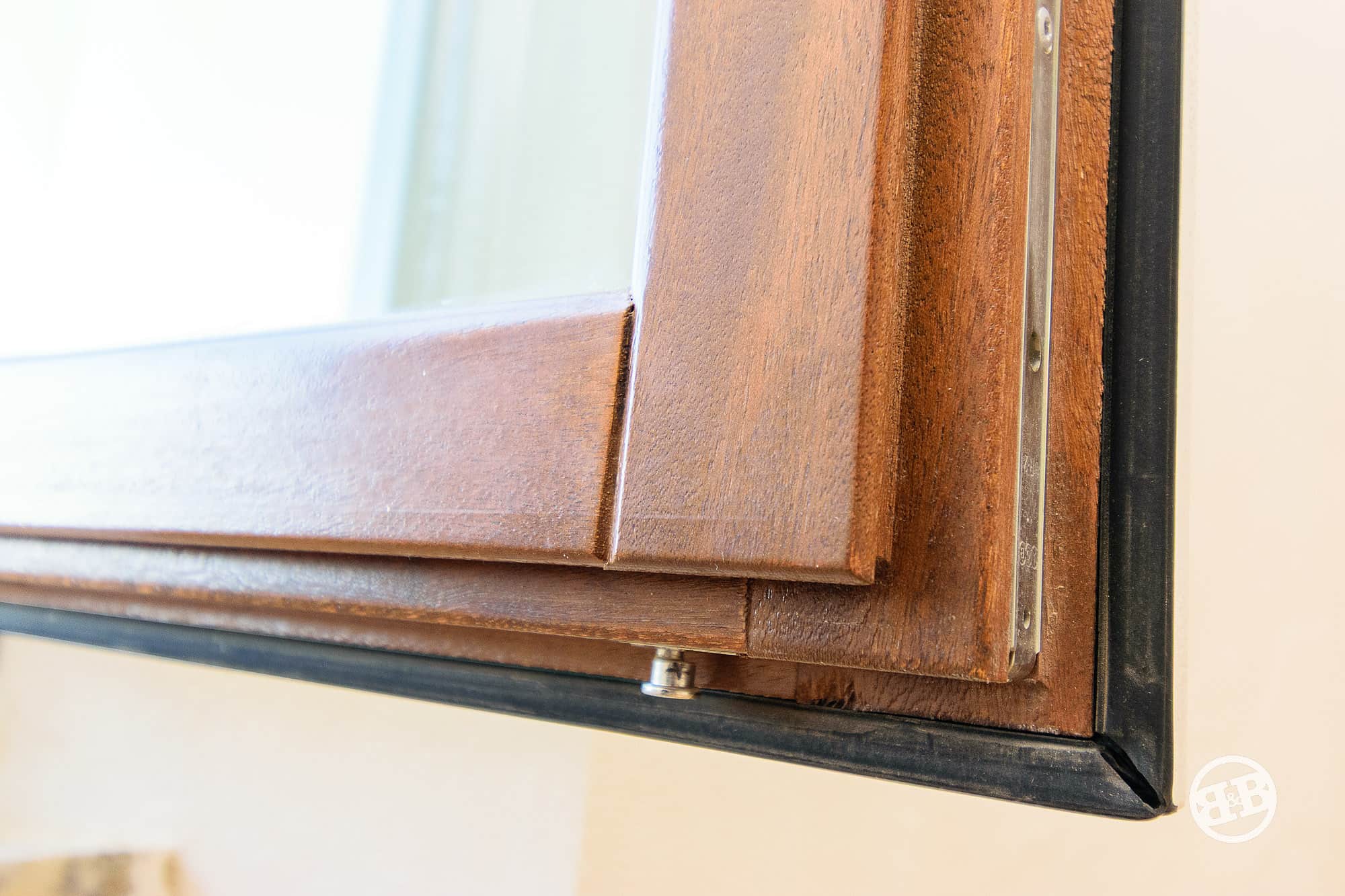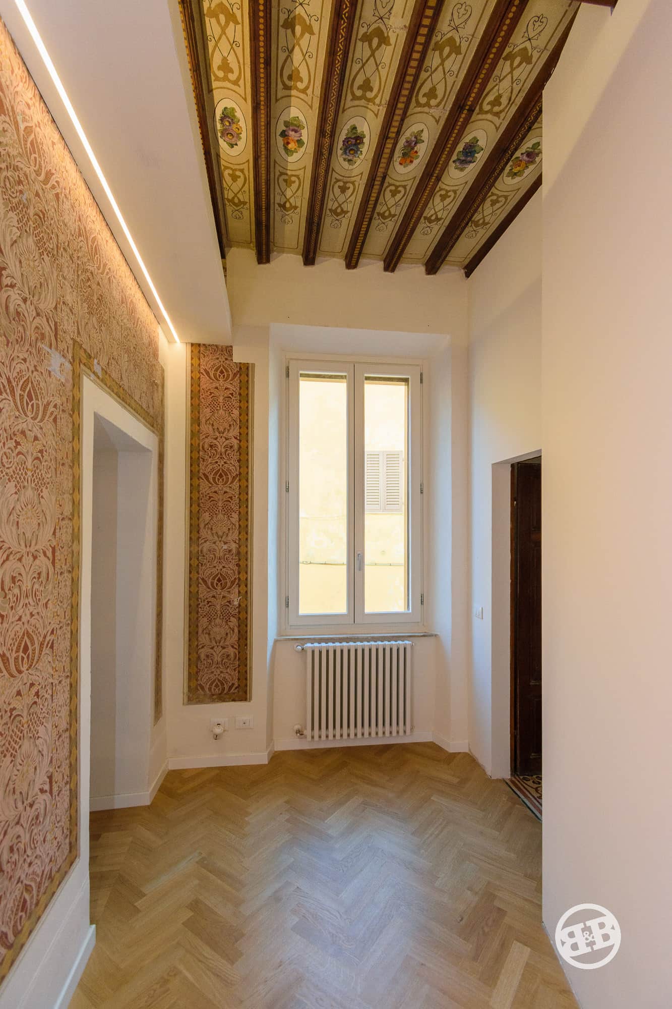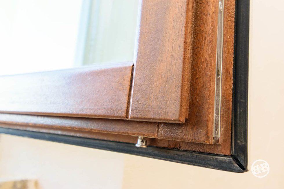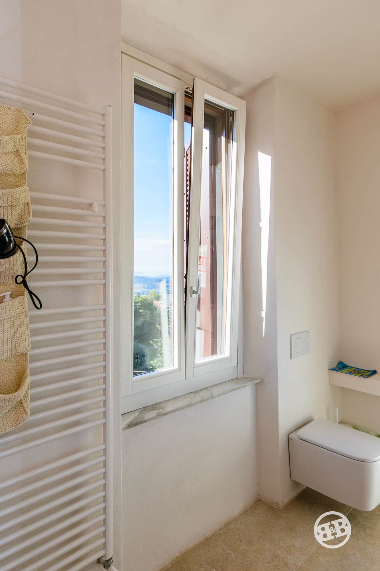 Gli infissi, modello Sigilla 68 Plus, presentano una finitura bicolore — interno laccato bianco RAL 9010 ed esterno noce castagno — studiata per integrarsi perfettamente con i vincoli estetici imposti dal contesto storico.