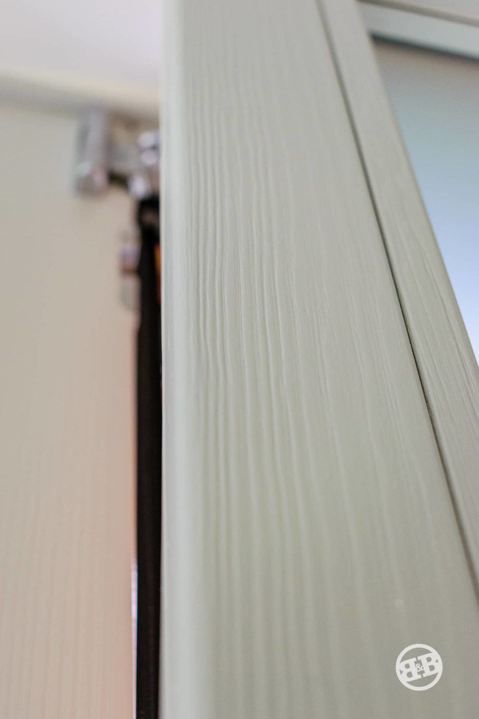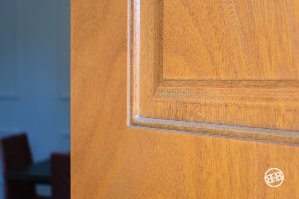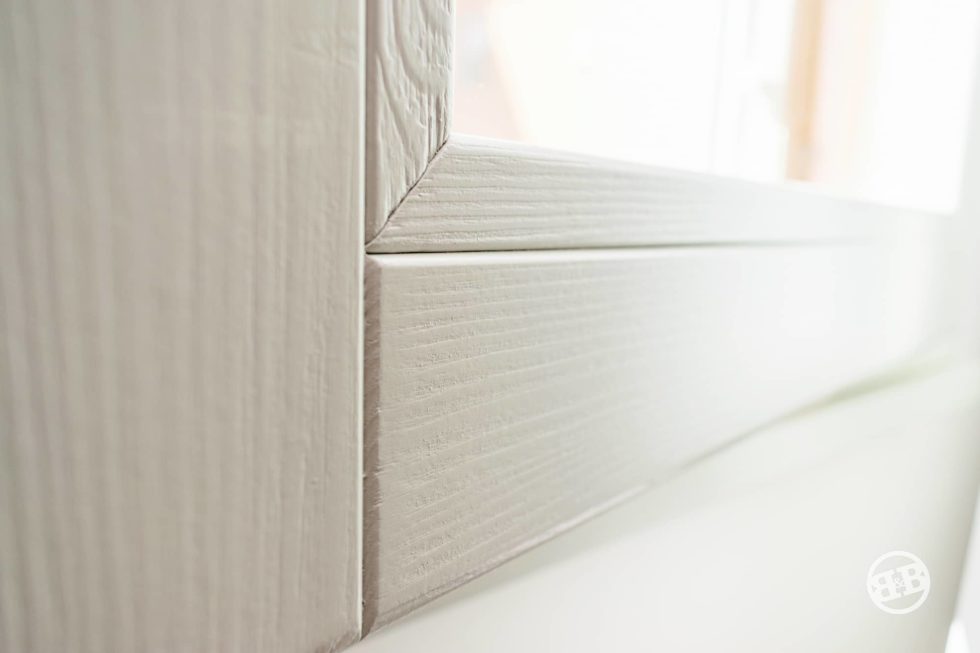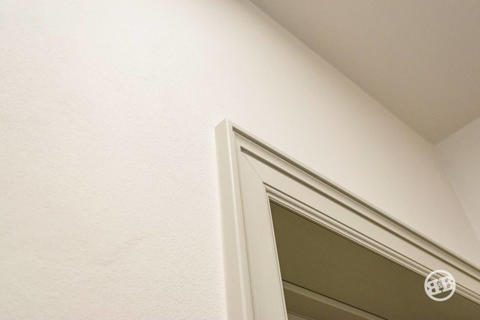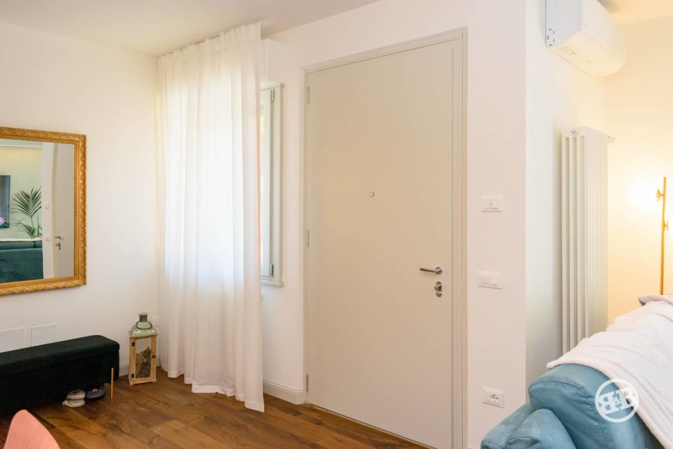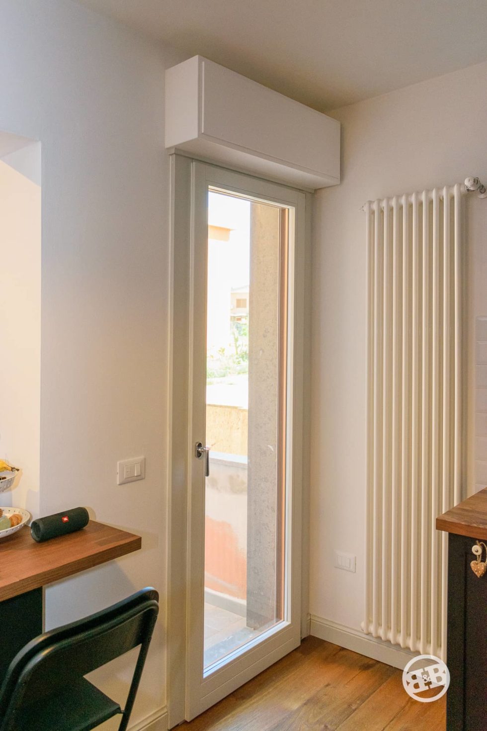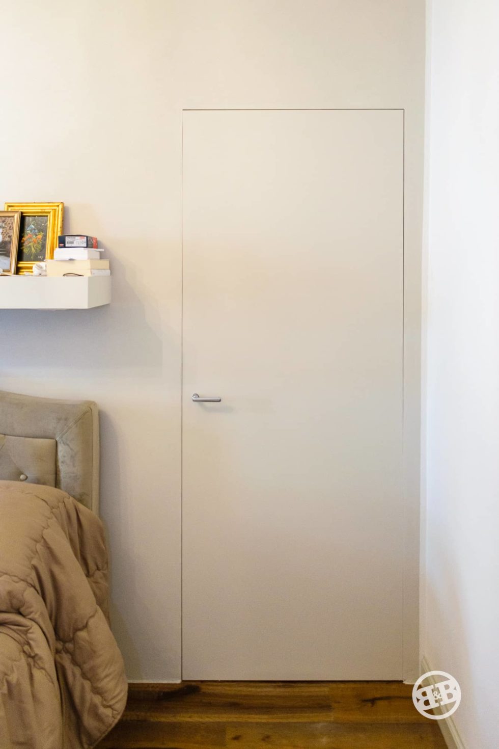 • Porte interne in noce tanganica tamburato, con cornici in rilievo e coprifili lavorati da 120 mm, il tutto verniciato RAL 9002 per continuità cromatica. Alcune porte sono state realizzate a filo muro per un effetto moderno ed essenziale.