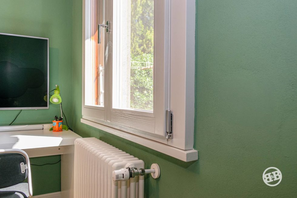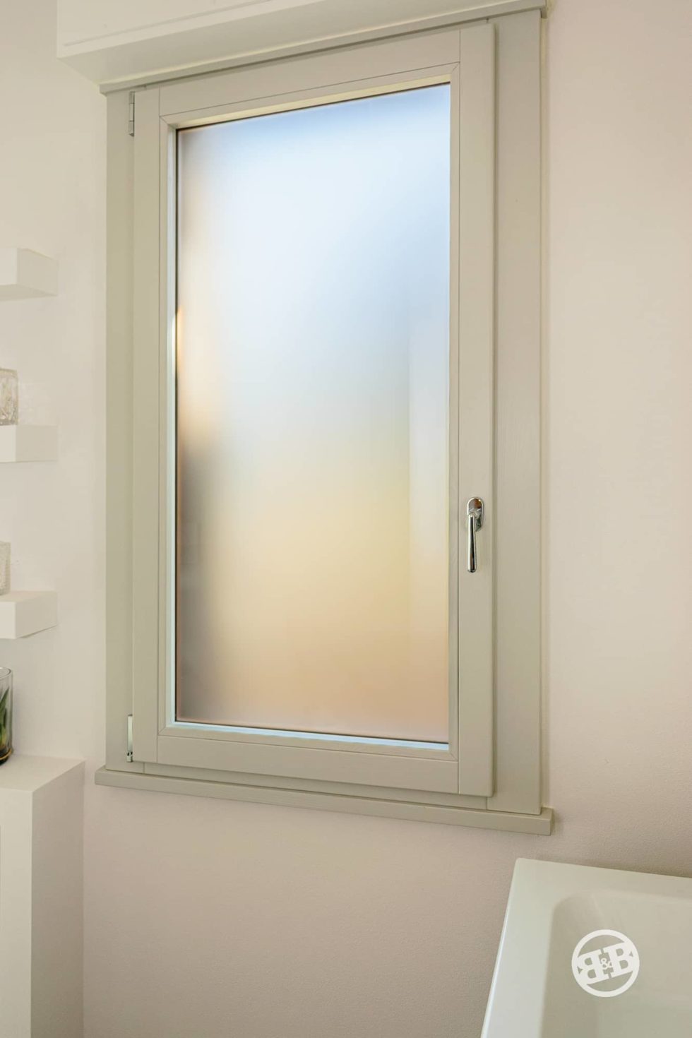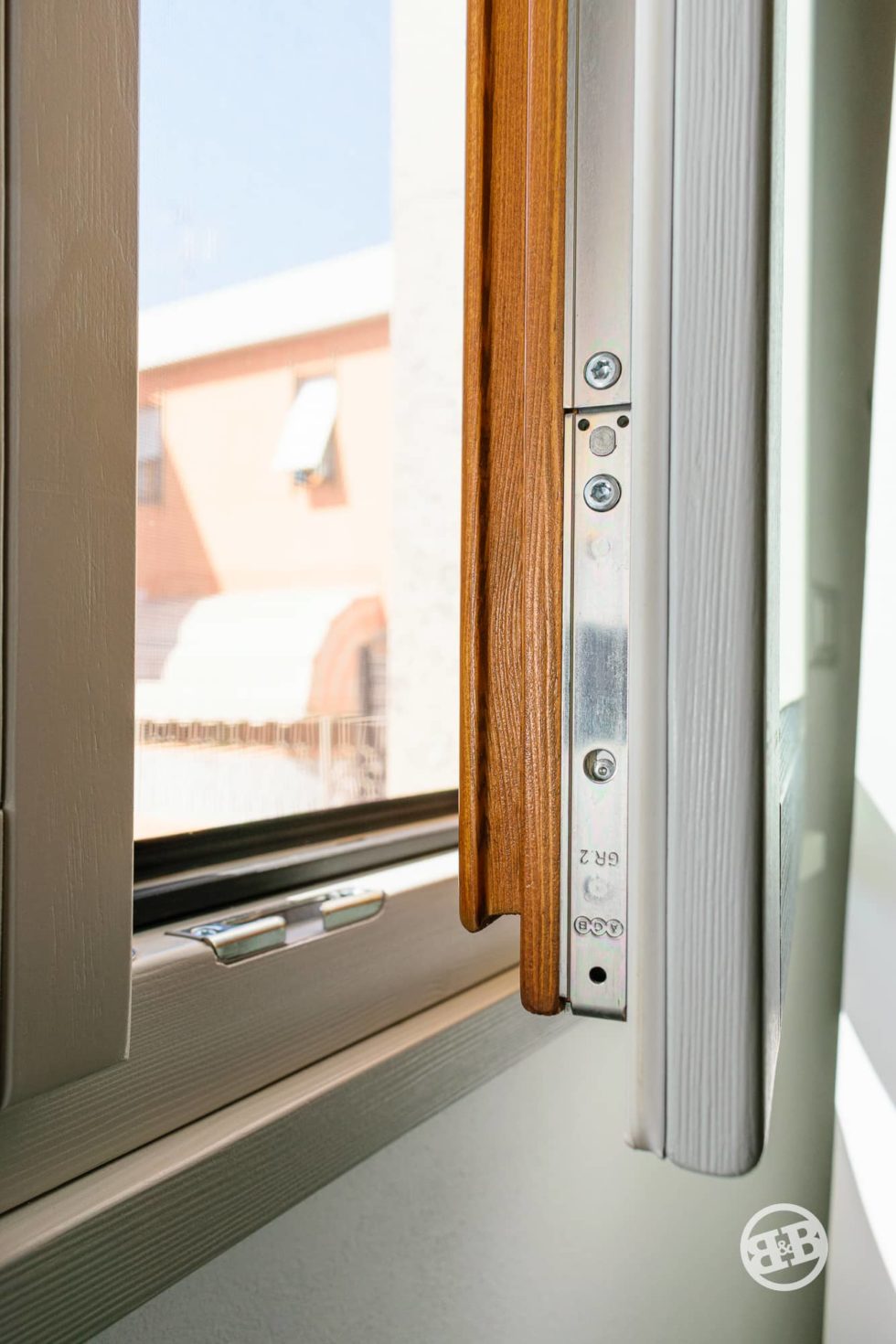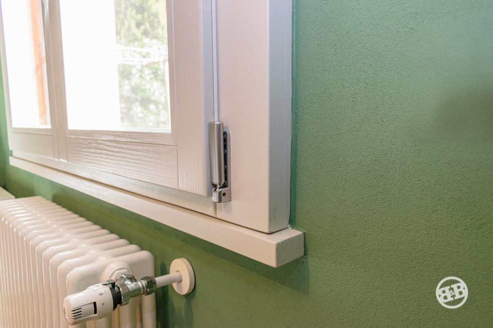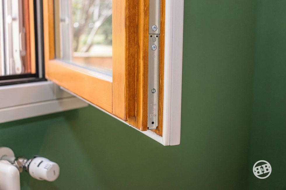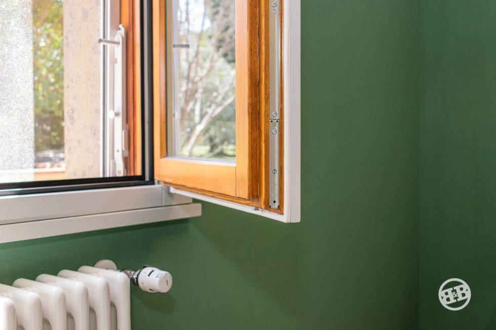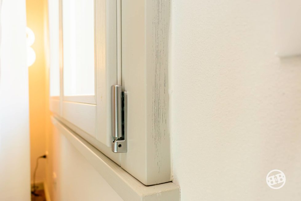 • Finestre e portefinestre in legno pino lamellare sfibrato, con finitura bicolore: bianco RAL 9002 all’interno e noce/larice all’esterno. Le maniglie, modello Pressburg, sono firmate Arieni in elegante cromo lucido. I vetri installati sono ad alto risparmio energetico e garantiscono un eccellente abbattimento acustico di 40 dB.