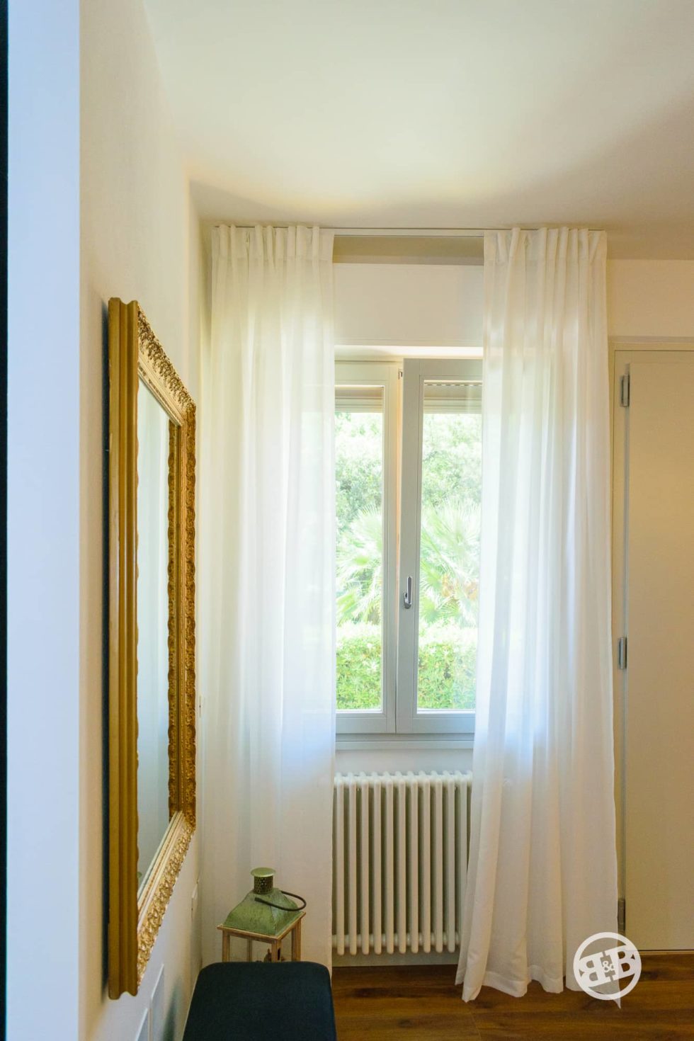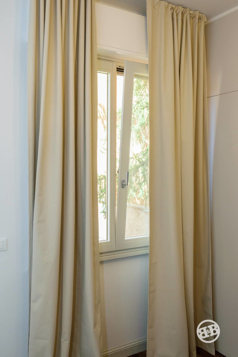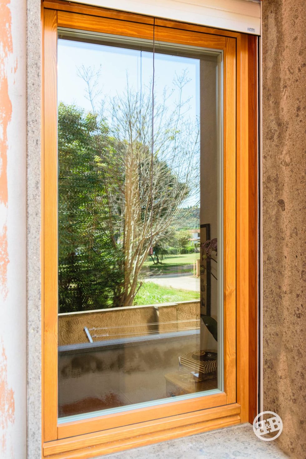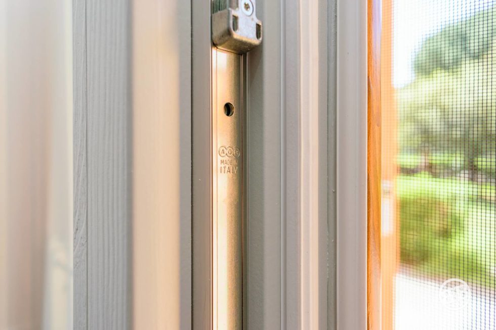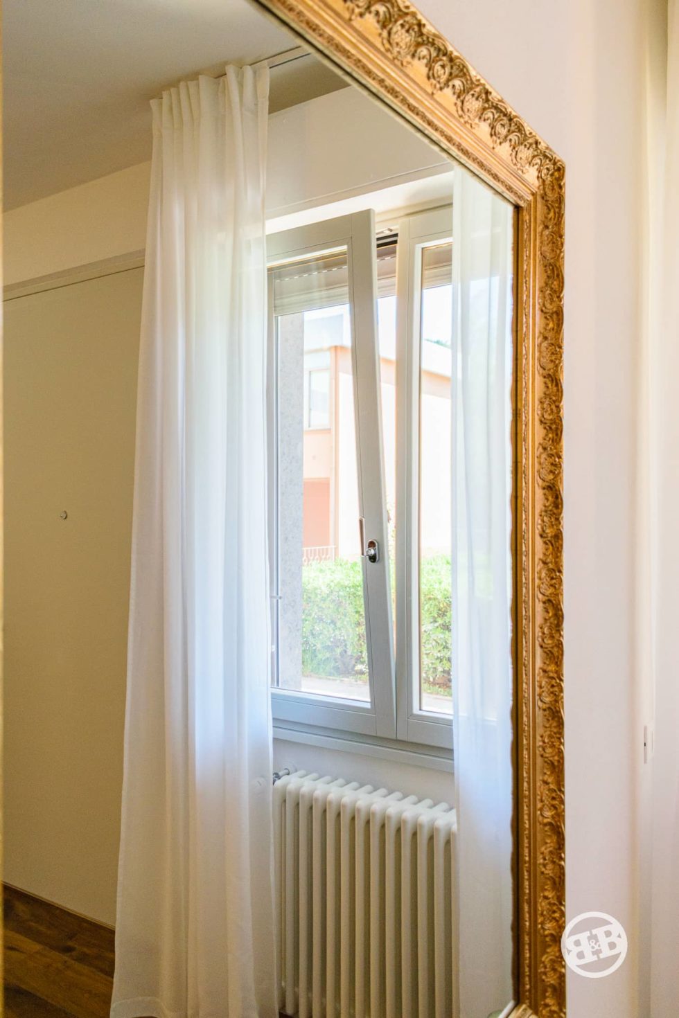 • Finestre e portefinestre in legno pino lamellare sfibrato, con finitura bicolore: bianco RAL 9002 all’interno e noce/larice all’esterno. Le maniglie, modello Pressburg, sono firmate Arieni in elegante cromo lucido. I vetri installati sono ad alto risparmio energetico e garantiscono un eccellente abbattimento acustico di 40 dB.