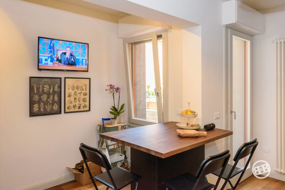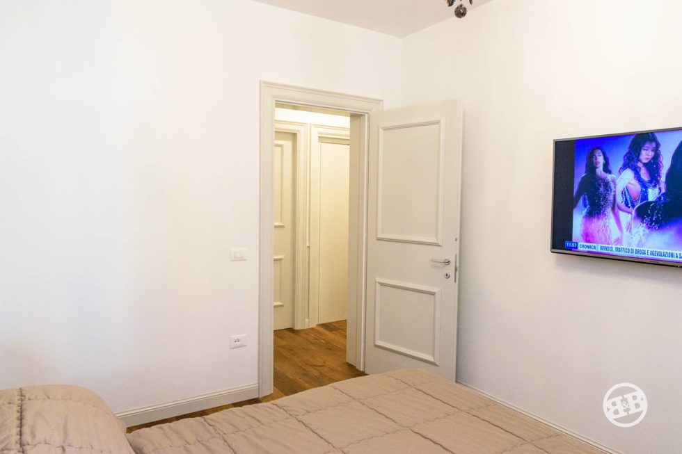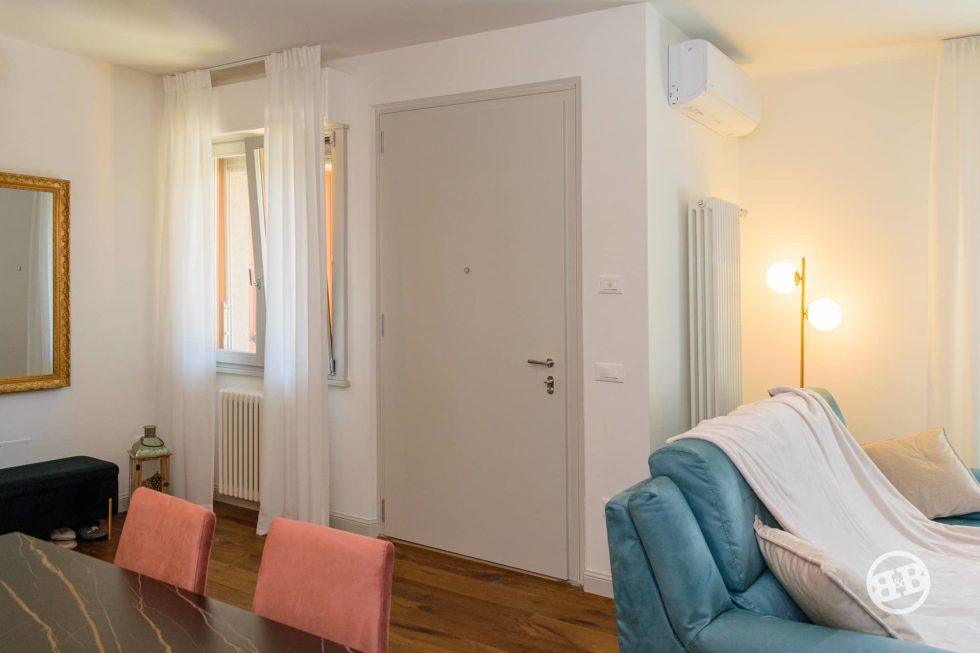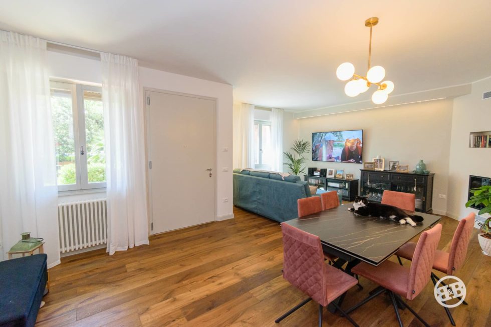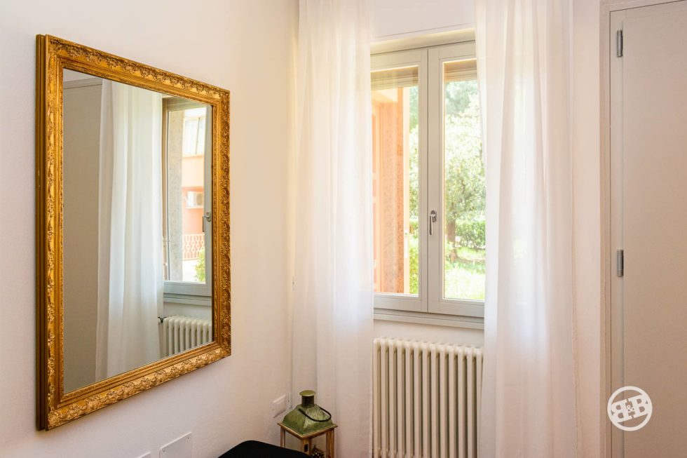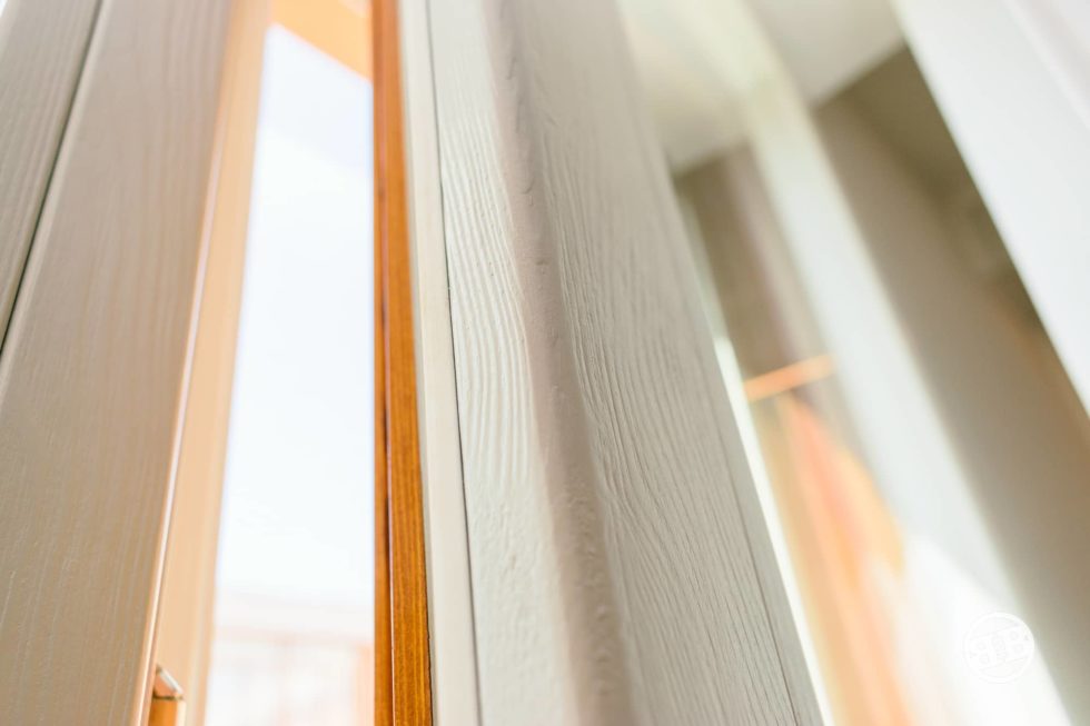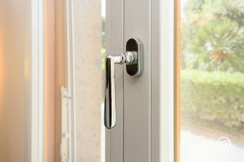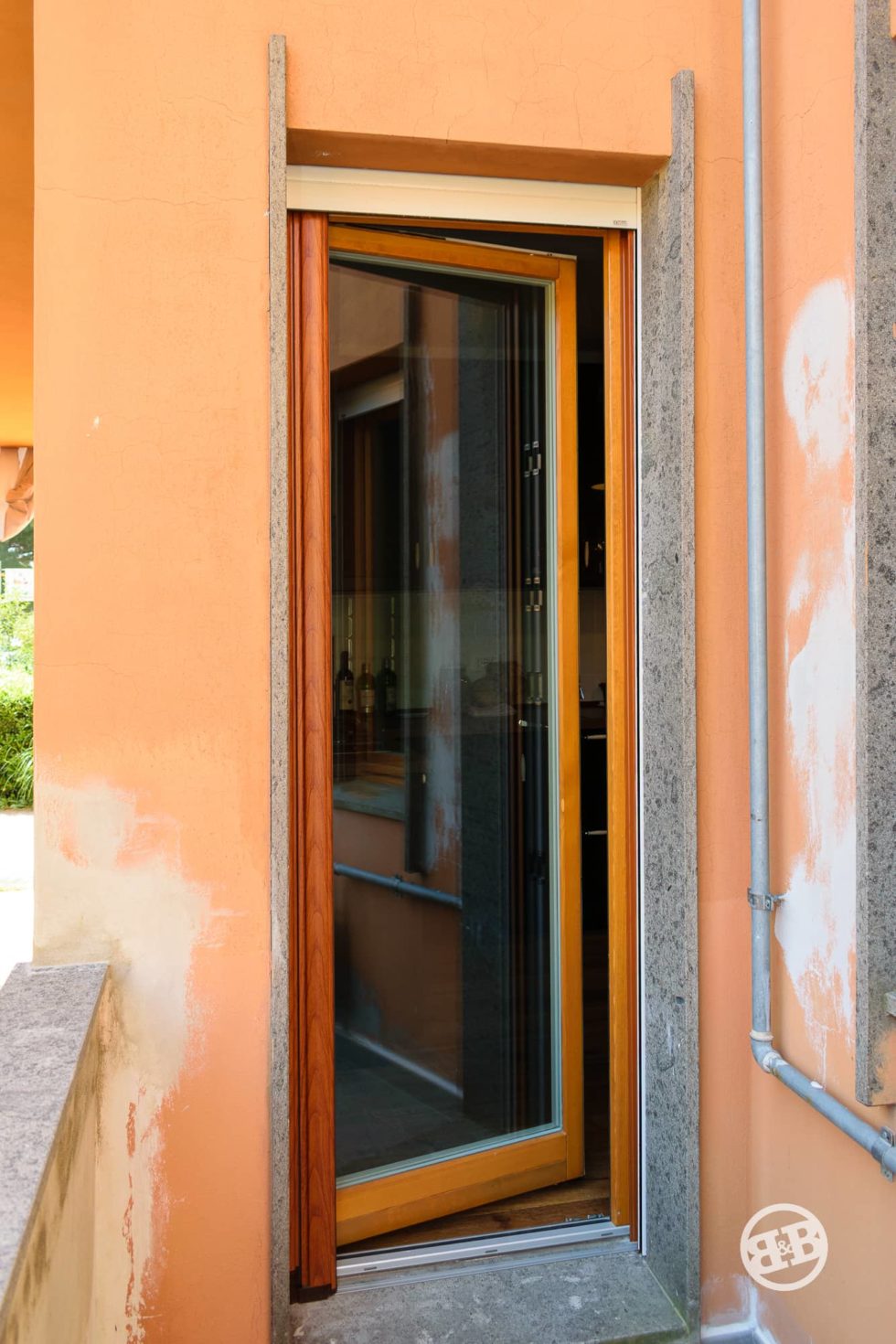 • Finestre e portefinestre in legno pino lamellare sfibrato, con finitura bicolore: bianco RAL 9002 all’interno e noce/larice all’esterno. Le maniglie, modello Pressburg, sono firmate Arieni in elegante cromo lucido. I vetri installati sono ad alto risparmio energetico e garantiscono un eccellente abbattimento acustico di 40 dB.