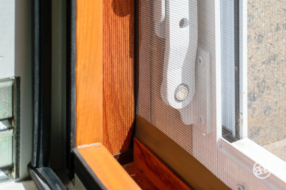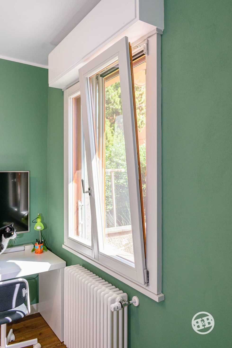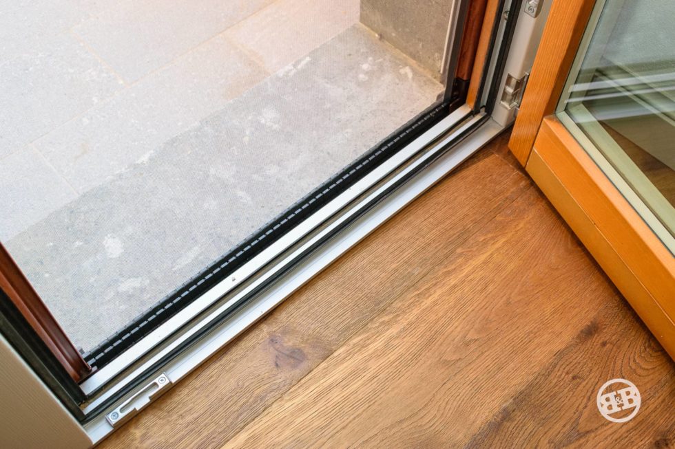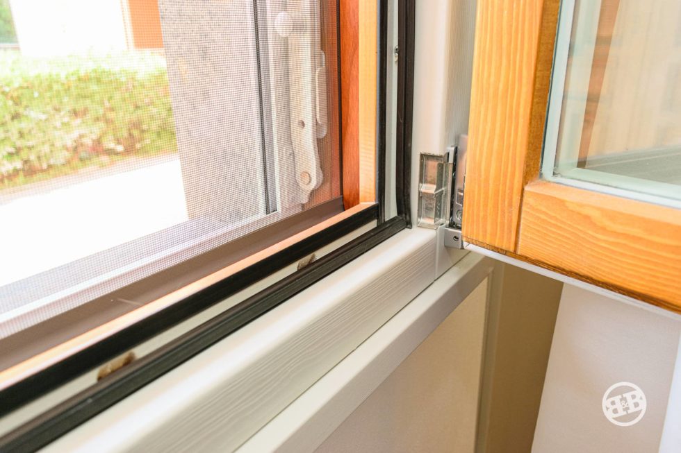 • Zanzariere a incasso, in alluminio frizionato, con una raffinata finitura effetto legno ciliegio, perfettamente integrate nella struttura.