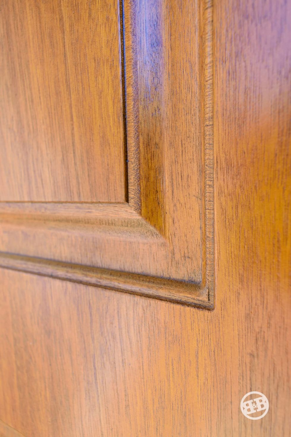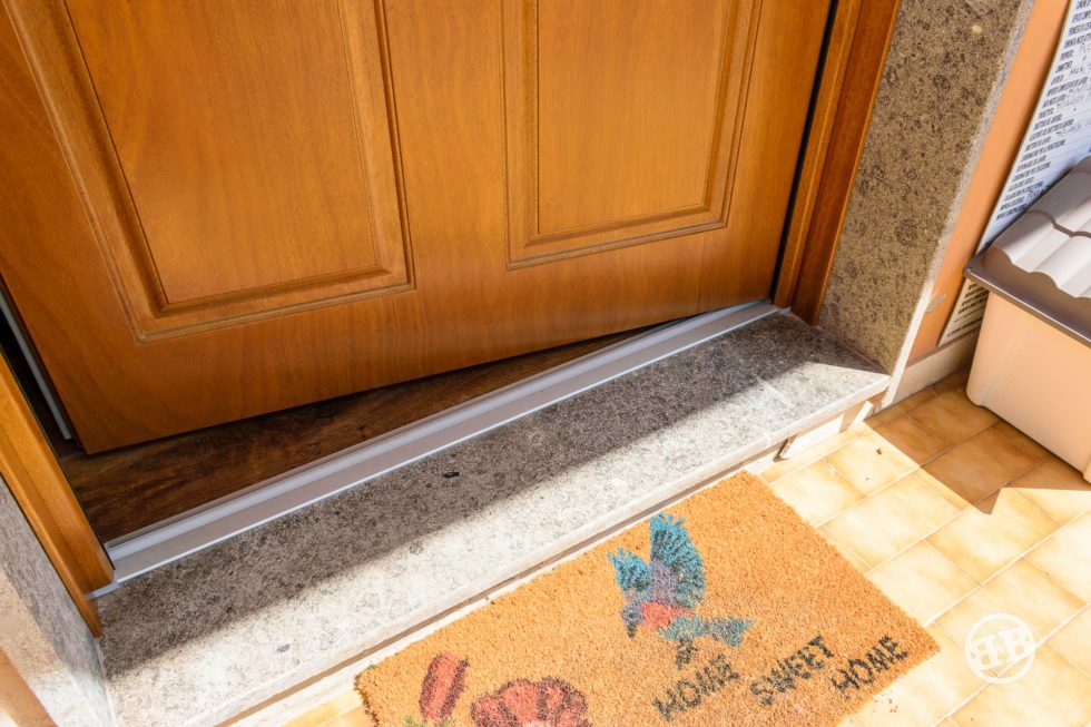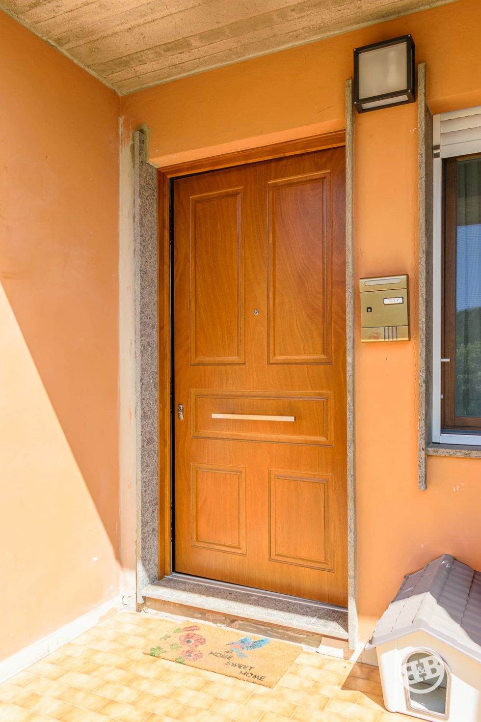 • Portone blindato con pannello esterno pantografato su multistrato di mogano okumè finitura noce/larice. Il pannello interno è liscio in RAL 9002 per armonizzarsi con gli interni. Completano il portone un maniglione Arieni, soglia CCE e serratura di sicurezza.