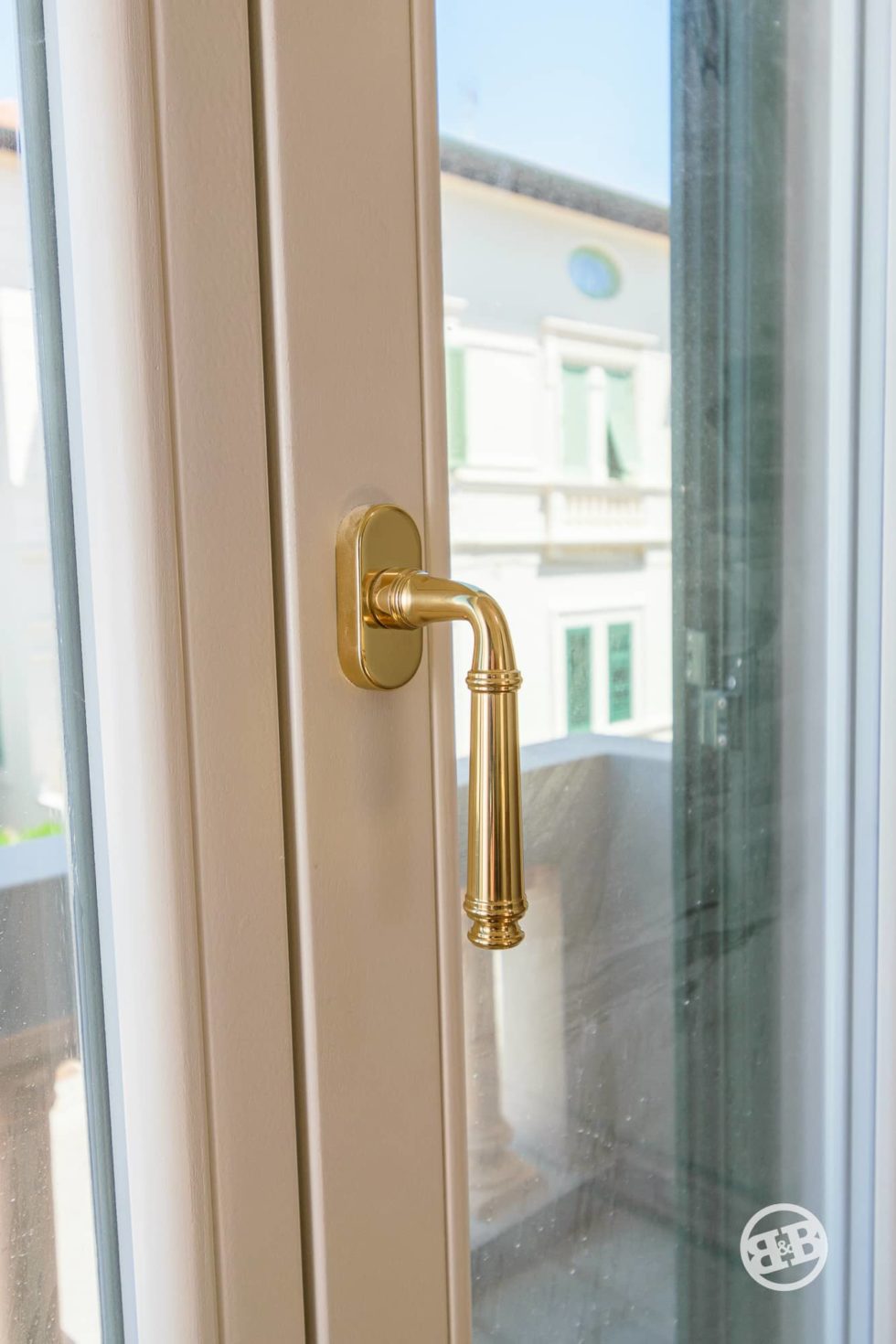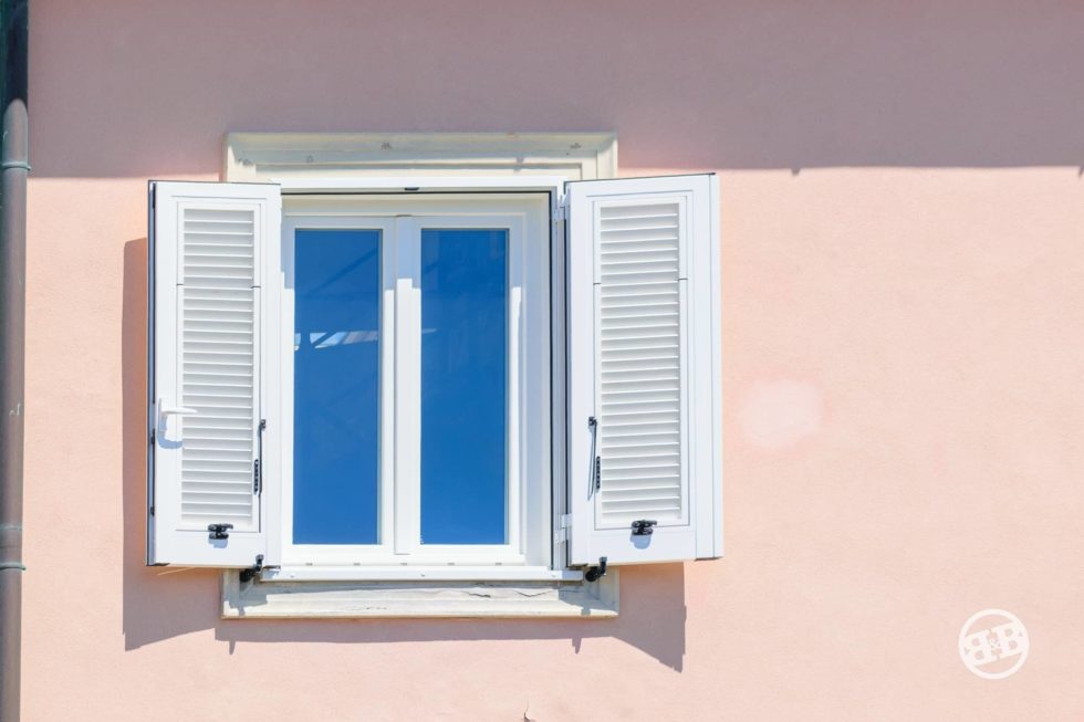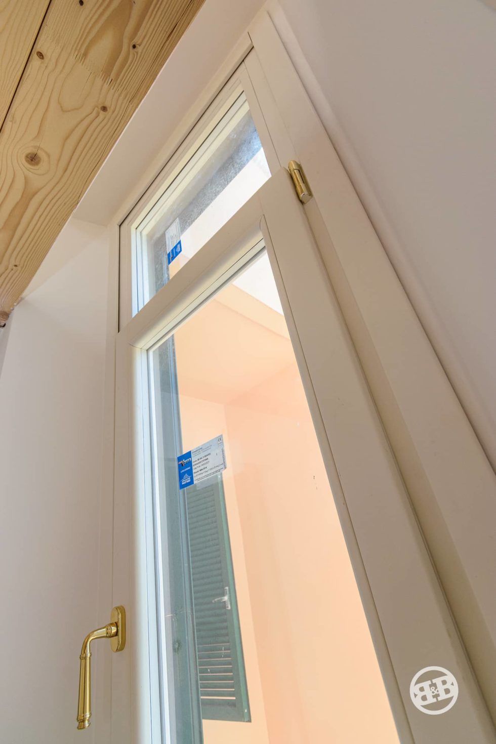 Le finestre e portefinestre installate sono realizzate in mogano okumè lamellare, laccate bianco RAL 9010 e dotate di vetrocamera 33.1 Infinity con gas Argon. La ferramenta AGB con apertura anta/ribalta e le guarnizioni in EPDM garantiscono ottime prestazioni di isolamento termico e acustico, con valori Uw fino a 1.27 W/m²K.