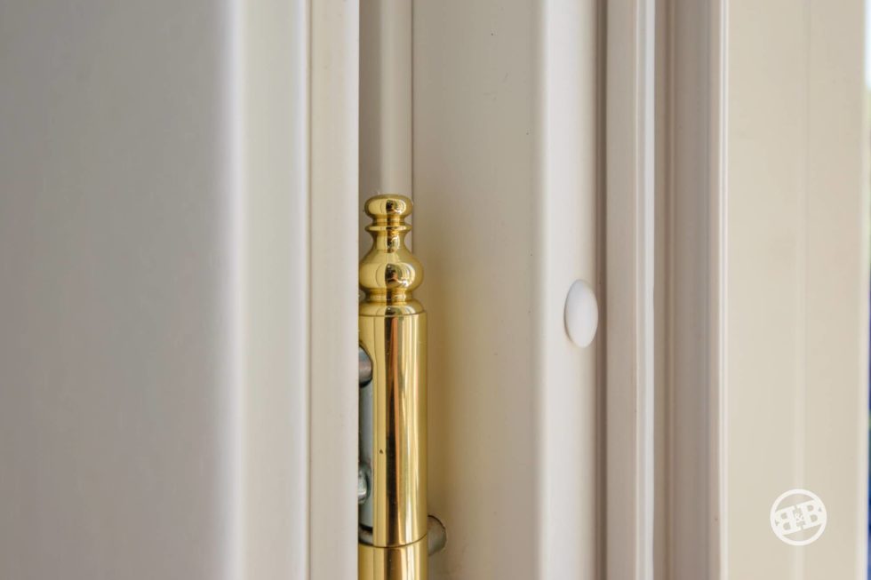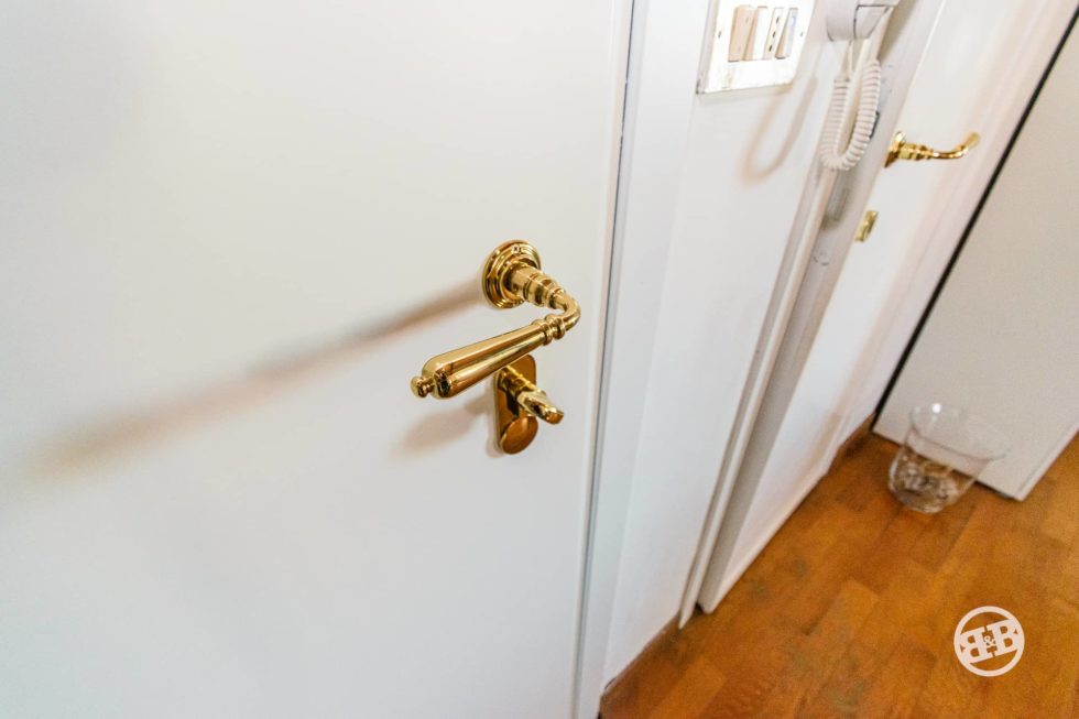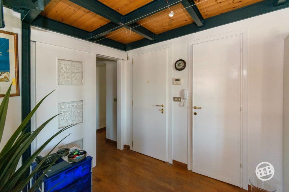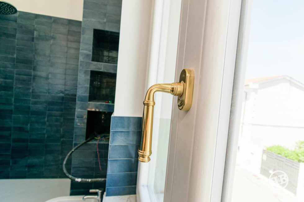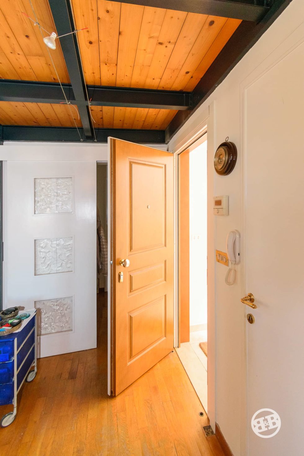 Completa il lavoro un portone d’ingresso in legno massello, finitura noce larice satinato, coibentato internamente e dotato di ferramenta automatica e maniglieria in ottone.